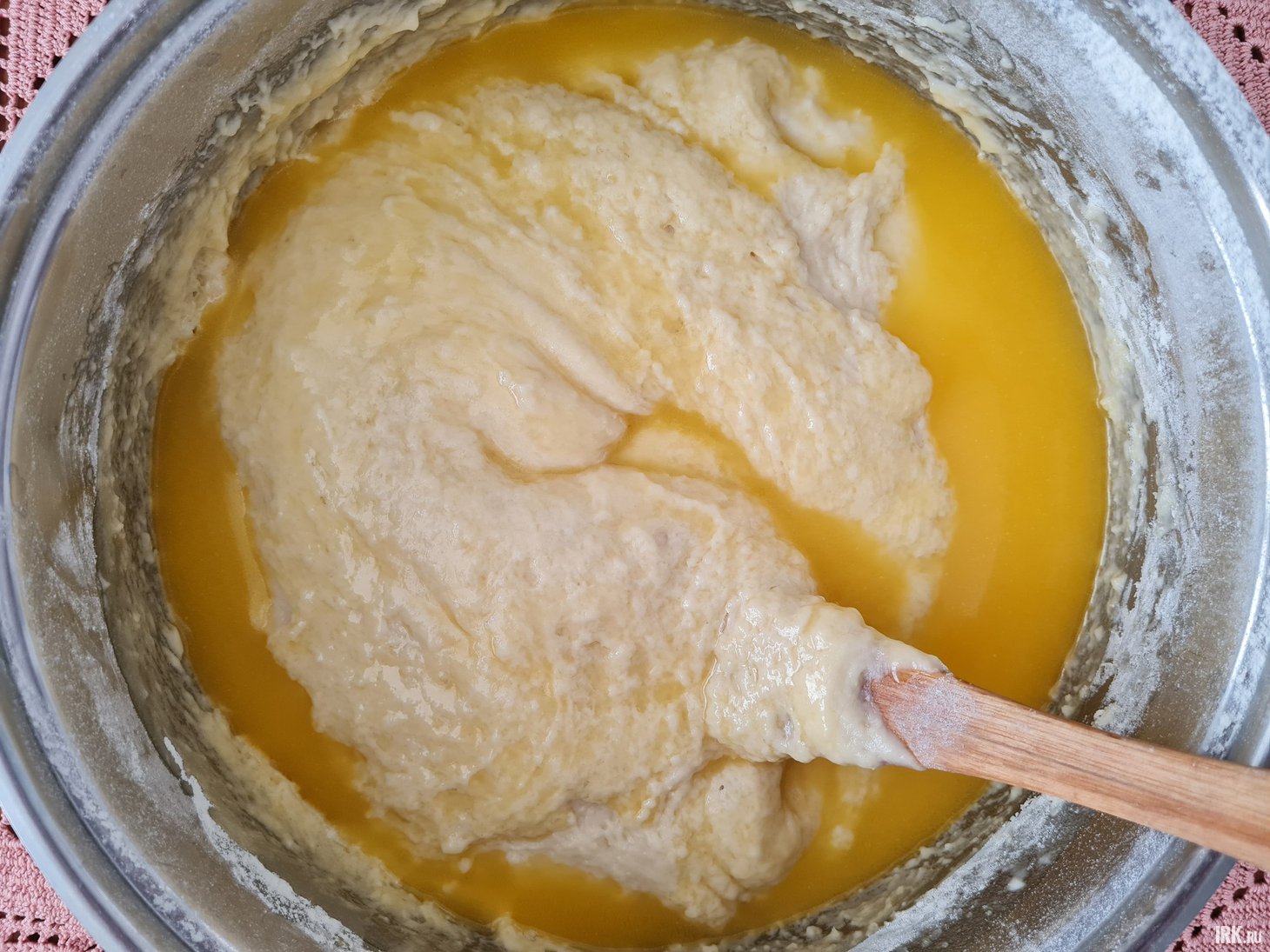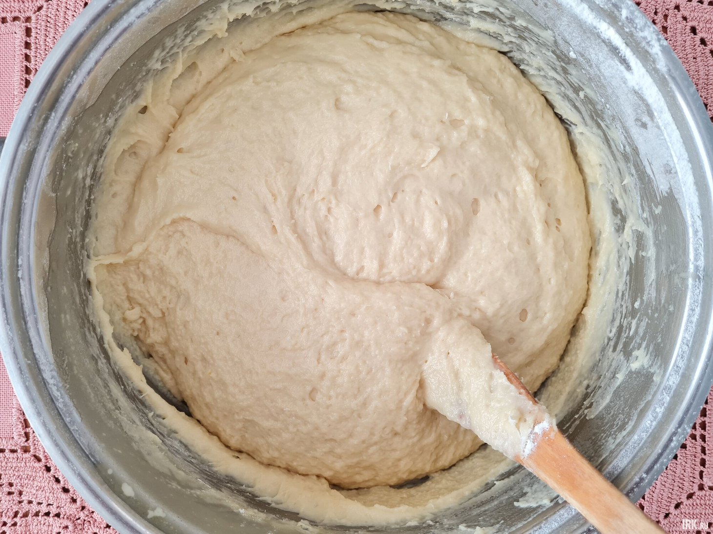 Перемешайте. Добавьте еще просеянной муки, чтобы добиться консистенции густой сметаны. Всего в тесто уйдет 900 грамм муки, еще 100 грамм оставьте для разделывания.