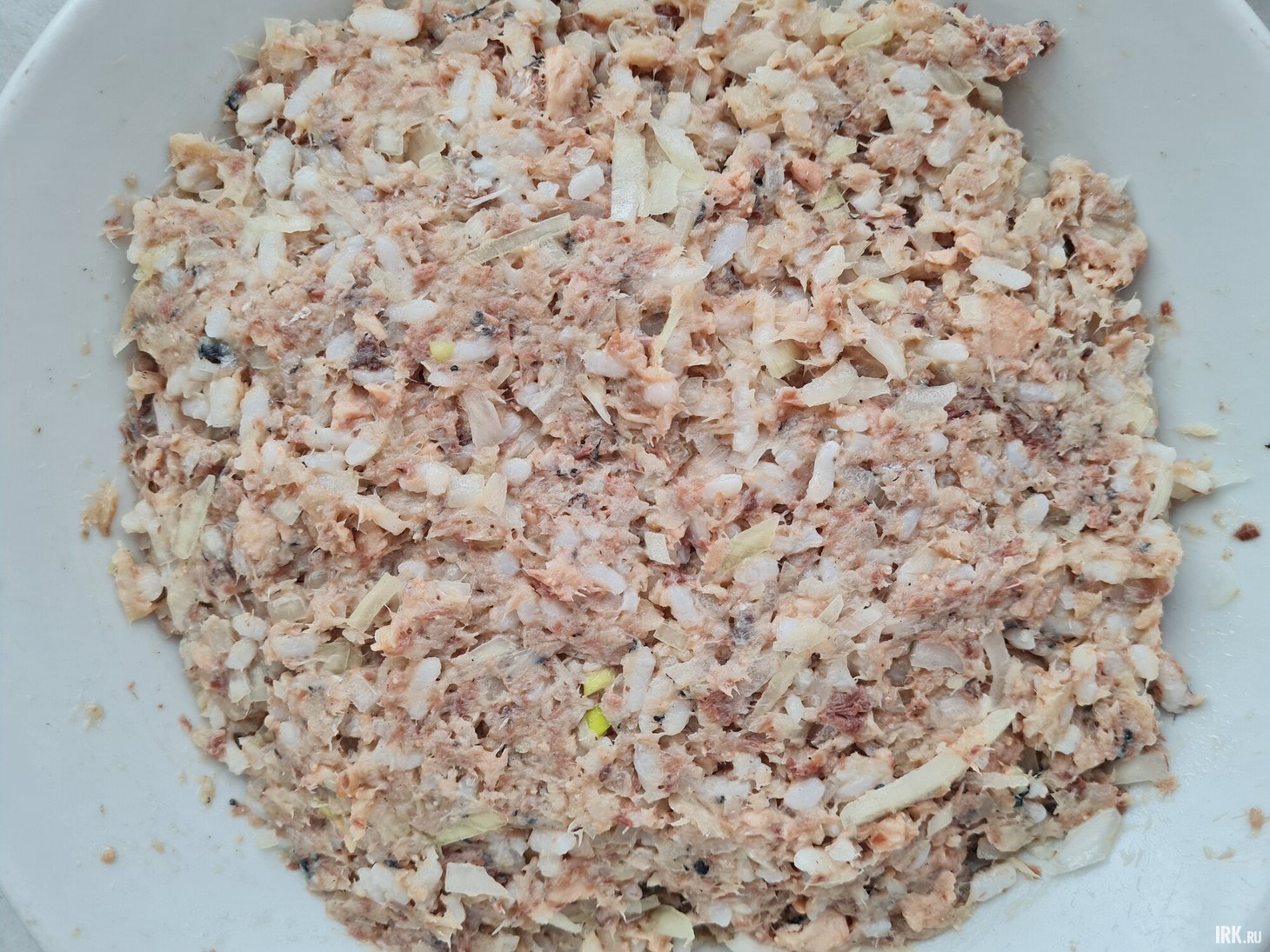 Возьмите консервированную рыбу в собственном соку (можно и с добавлением масла), слейте жидкость (или масло) – она не используется. Разомните вилкой. Добавьте остуженный рис, сырое слегка взбитое яйцо, лук. Перемешайте начинку.