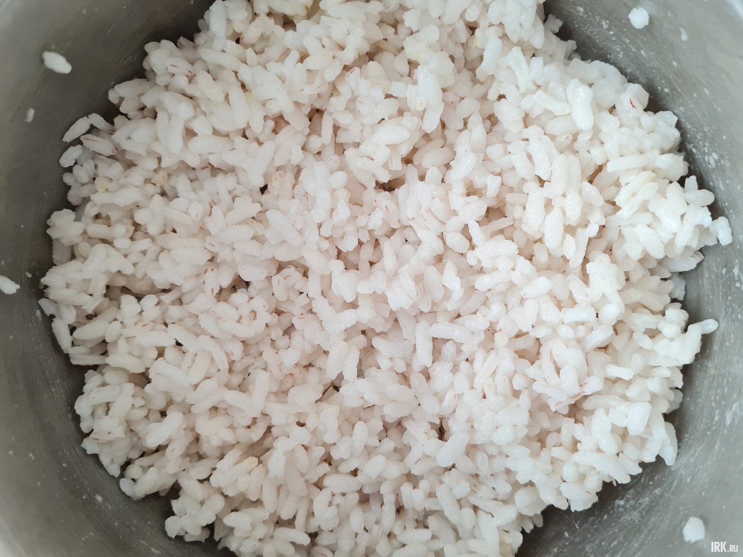 Пока тесто поднимается, приготовьте начинку. Отварите круглый рис в воде без соли.