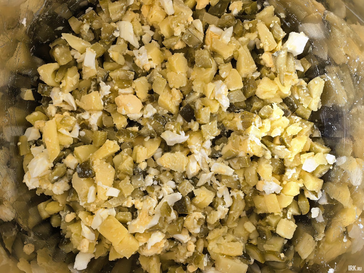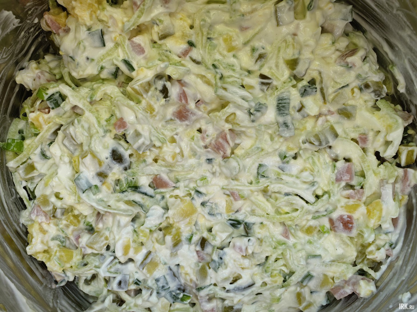 Теперь добавьте майонез, сметану. Хорошо перемешайте.