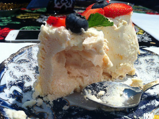 Когда я делала заказ, мимо проходила администратор и «очень порекомендовала» мне попробовать этот десерт. Прислушалась — и зря. Обычное безе в творожном креме. Причем, вроде как, есть его руками не комильфо — много крема, а есть безе ложкой… В общем, не поняла этот десерт совсем. Тройка. Лучше бы пахлаву попробовала.