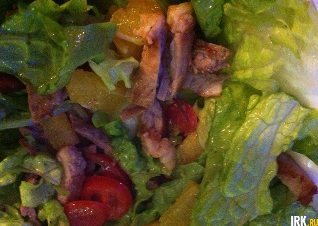 Салат не понравился совсем. Пережаренная свинина с кусками сала, обилие оливкового масла делали блюдо слишком жирным. В меню указано: «Интересную ноту придает дуэт грейпфрута и апельсина». Грейпфрута не было, «интересной ноты» тоже. Для заведения такого уровня, еще и за приличную сумму — просто кошмар, а не блюдо: помидоры, ворох листьев салата, масло и мясо. Ну, и единственная радость — сочный спелый апельсин.