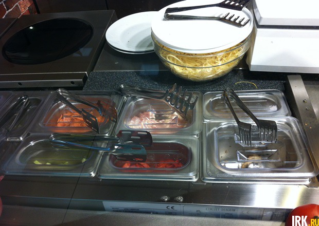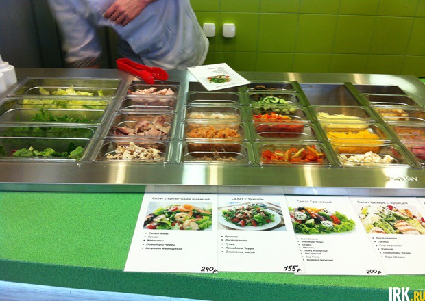 Заказывать салат можно не только из меню: перед вами контейнеры с разными продуктами, повар положит в вашу тарелку все, что захотите. Дополнить салаты из меню тоже можно без проблем. Так, я заменила в своем салате фасоль на кедровые орешки. Пока готовился салат, пообщалась с поварами-владельцами. Очень милые ребята, меню и оформление придумали сами, несмотря на то, что есть уже франшизы подобного направления. Даже удивительно, почему в Иркутске раньше не открыли подобное место. Проще не придумаешь: заготовить заранее ингредиенты и соединять их по желанию гостя. Главное, за чем нужно пристально следить, — качество и свежесть продуктов.