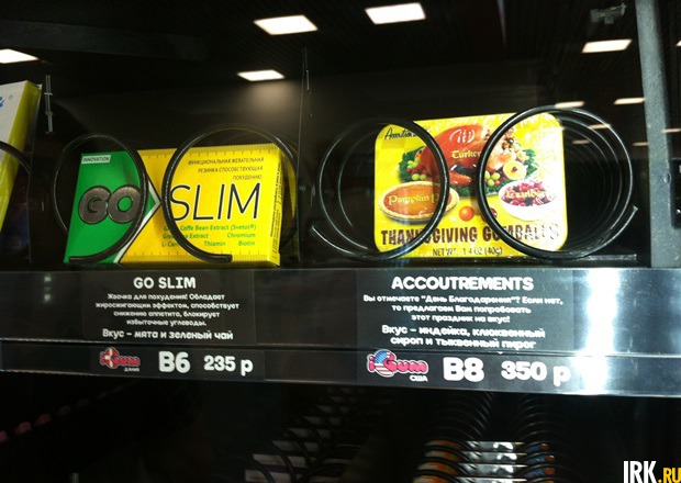 На выходе из «Комсомолла» стоит автомат по продаже жевательной резинки со всего мира. Запасы в автомате уже порядком истощились, видимо, не так часто их пополняют. Но киоск с пестрыми обертками по-прежнему приковывает внимание прохожих: как ни пройду мимо, там всегда кто-нибудь стоит, рассматривает. Здесь можно найти «любимую» жвачку голливудских актеров, жвачку, улучшающую память, жвачку для похудения… Покупать такое лакомство решаются немногие: цена слишком высокая — 100—350 рублей. Но интересно, конечно…