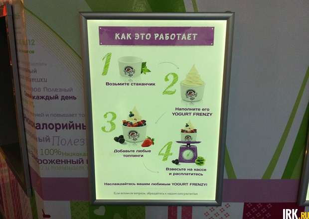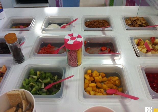 Отличнейший киоск располагается на первом этаже «Комсомолла». Пошаговая инструкция нарисована прямо на стенке ларька, но я лучше распишу в красках. Вы берете стаканчик, выбираете вкус йогурта (есть классический, гранатовый, «печенье с кремом» и кокосовый), нажимаете на небольшой рычаг и наблюдаете за тем, как желаемое количество йогуртовой массы наполняет стаканчик. Кстати, перед тем, как заплатить за целый стакан, вы можете каждый йогурт попробовать (что я и сделала), для этого на прилавке лежат небольшие формочки. Далее вы можете дополнить свой йогурт различными топингами: фруктами, ягодами, шоколадками, полить сиропами. Потом продавец взвешивает ваш десерт и называет цену.