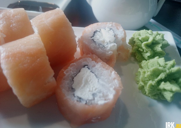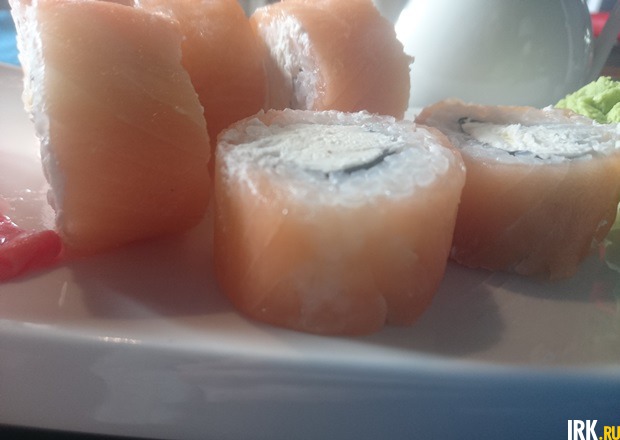 Жирный минус за внешний вид. Никак не думала, что в нашем городе еще остались повара, которые не знают, как нарезать роллы, чтобы по поверхности кусочков не размазался сыр. Этот секрет давно известен даже домохозяйкам. К тому же, слой рыбы был неровным и тонким настолько, что обнаруживал рис. Собственно только его и ощущала, помимо сливочного сыра – неплохой такой рис, в меру рассыпчатый, клейкий и чуть сладковатый. Рыба была бледная, водянистая и абсолютно безвкусная. И лист нори еле прожевывался.