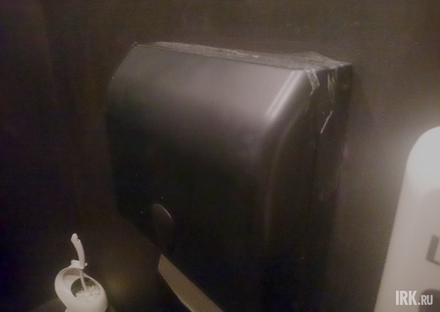 Диссонанс ощущается и в тесном туалете. Там так же, как в зале, висит большая изящная люстра. Но при этом темно, грязно, выступ на полу, будто его кто-то грыз, держатель салфеток наскоро склеен скотчем.