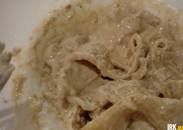 Тарелка ласково прихлюпывала, когда я цепляла ленточку феттучини вилкой. Макароны (действительно хорошие, действительно аль денте) плавали в таком обилии сливок и масла, что, пожалуй, впервые мне захотелось, чтобы соуса в пасте было меньше. Это невозможно жирно! Совершенно точно без масла блюдо бы только выиграло.
