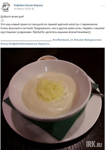Подогревали интерес и внушительные изменения в меню «Белой вороны». Узнала об этом по серии публикаций в группе заведения ВКонтакте: каждому блюду посвятили отдельный пост с фотографией и подробным аппетитным описанием. В общем, я заинтересовалась и в этот же день вместе с подругой уже сидела в маленькой кофейне на цокольном этаже цветочного павильона по улице Карла Маркса.