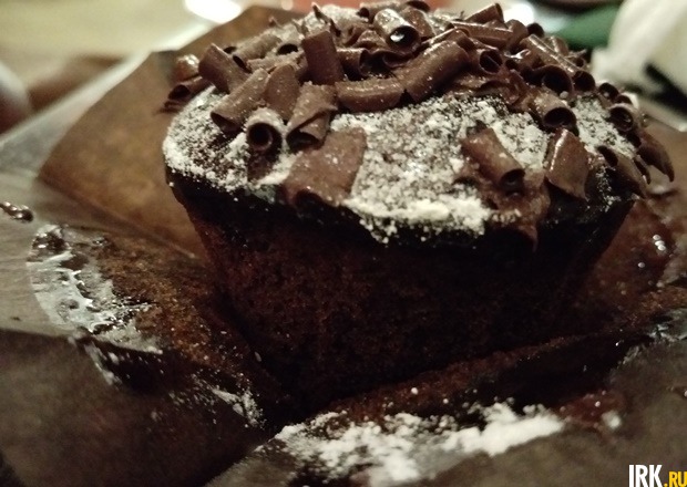 Возможно, десерт и был свежим. Но тесто замесили так, что на вкус сей маффин был до тоски сухой. Его совершенно не спасал тонкий слой жидкого шоколадного крема и стружка. Еще на зубах что-то хрустело, я так и не поняла, что именно. Возможно, сахар, возможно, орехи. Но хотелось бы верить, что это было что-то съедобное.