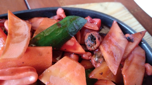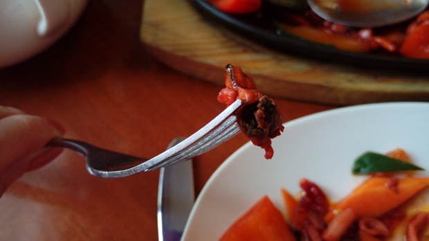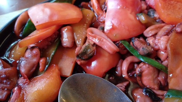 Единственное, что возможно было есть — это кальмары. И то они уже немного полежали с мидиями и стали горькими. Соус мог бы всё спасти, но он плавал где-то на дне и был весьма тусклым. Томатный? Устричный? Я и не помню.