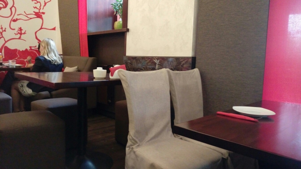 Войдя в помещение, с удовольствием и не без удивления отметила сдержанность стиля в интерьере: никаких райских птиц, аляпистых дешёвых скатертей, позолоты и прочих характерных для «едален» с подобной концепцией деталей. Преобладает сочный красный и белый цвета, местами замечены ненавязчивые рисунки драконов. Аккуратно, просто и уютно. Ничего не бросается в глаза и ничего не раздражает.