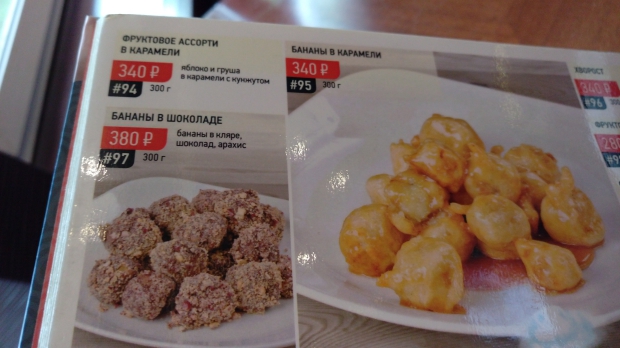 Меню тоже симпатичное. Некоторые позиции сопровождают аппетитные картинки — на эти блюда больше всего и обращаешь внимания. Во всяком случае, большинство кушаний я заказала, вдохновившись именно яркими фотографиями. И было немного жаль, что представленную общим списком еду (довольно большое количество любопытных блюд, кстати), оформляя заказ, я попросту не заметила. Вероятно, их нарочно отодвинули на второй план. Но стоит отдать должное удобству меню: блюда с подробным описанием чётко систематизированы и разделены по категориям. Я быстро определилась, чего хочу, так что в этом помощь официанта не понадобилась.