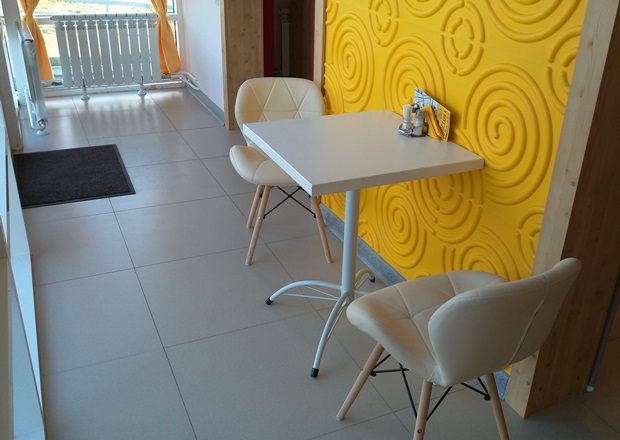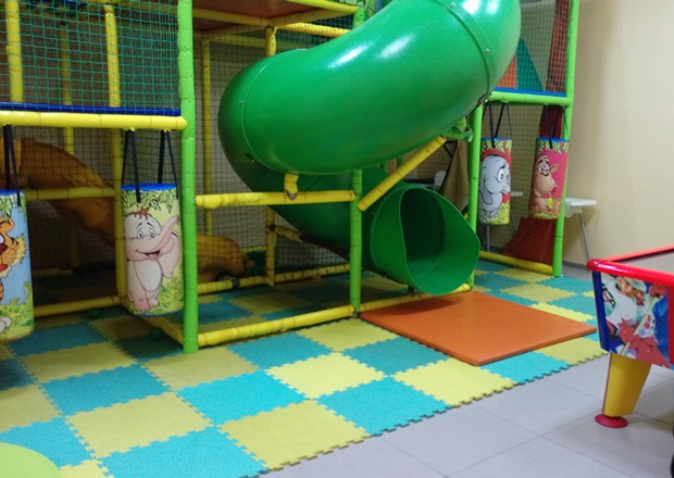 Заглянула в игровую, там вроде неплохо. А вот в самом кафе обстановка показалась какой-то незаконченной и непродуманной: повесили на каждую стену по картине так, знаете, чтобы совсем уж не пусто, на стулья повязали какие-то ленточки… Неуютно совершенно, особенно для семейного кафе. Еду решила заказать из детского меню. Блюдо ждала долго, около 30 минут.