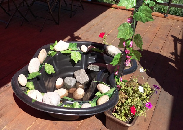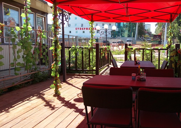 Зато рядом с «Пиццей хот» расположился павильон с игривым названием «Шашлык-машлык». Там телячий шашлык и люля-кебаб стоят как раз 200 рублей каждый. А купив шашлык из курицы, можно ещё и чай себе позволить. Собственно, я так и сделала. У кафе ещё и веранда есть на заднем дворике с неработающим фонтанчиком и искусственными украшениями-листьями — не ахти, какая, но всё же приятно, что есть возможность посидеть на воздухе.