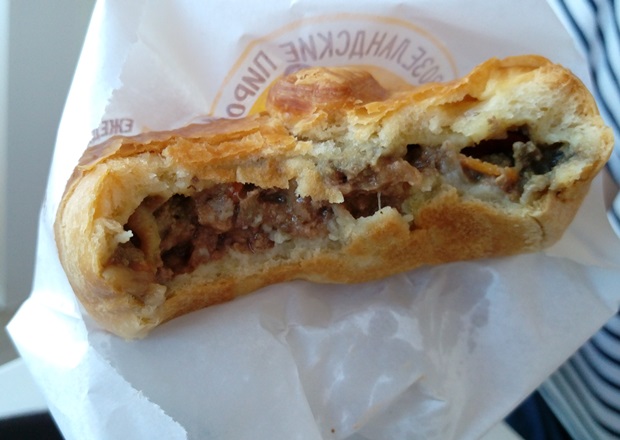 Из ограниченного вечернего ассортимента как-то сразу привлекла внимание слегка подрумяненная компания из пирогов с потрохами. Не могу сказать, что я поклонница субпродуктов, просто все остальное на витрине я уже пробовала. К пирогу заказала морс.