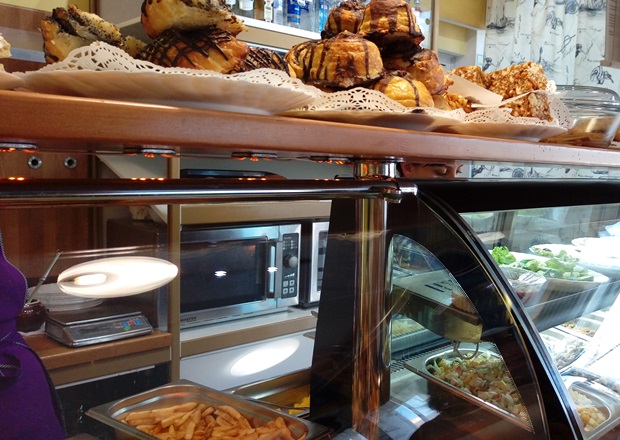 Еда здесь разложена в металлические контейнеры за витриной — как в столовой. Только тарелки вы берете не сами, а рассказываете кассиру, чего хотите, далее — расплачиваетесь, он разогревает блюдо и зовёт вас. Не совершенная система, но тут так заведено. Ассортимент блюд разнообразный, еда аппетитная, приветливее всех на меня смотрели колбаски. К ним взяла картофельное пюре и компот. Кассир позвал минуты через две.