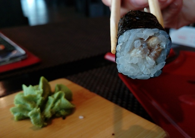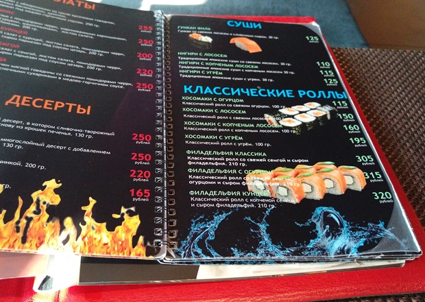 В «Сушилке» можно было заказать «Цезарь» с курицей, мороженое, суп, одну порцию суши, за 190 рублей купить десерт… Но меня больше интересовали классические роллы — всё-таки именно за ними обычно идешь в японский ресторан. Да и просто в этот день хотелось роллов, таких, знаете, с рыбой. В «Сушилке» могла себе их позволить, но объём порции не позволял надеяться, что наемся — за 200 рублей больше 100 граммов ничего найти не удалось. Была не была — остановила выбор на хосомаки с угрём. Моё ожидание скрашивало тяжёлое такое «тыц-тыц» из спортзала за стеной кафе: когда там открывалась дверь (а происходило это часто), музыка легко проникала в «Сушилку».
