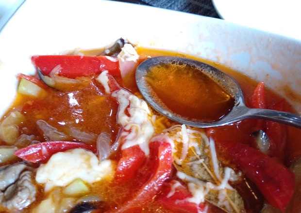 И мало того, что на поверхности довольно скудного количества бульона плавал этот нездоровой толщины маслянистый слой, так блюдо ещё и сыром присыпали… Из всего этого жирного месива меня устроила только говядина — не жилистая, вполне съедобная. Выловила из супа мясо — тарелку тут же отодвинула на край стола.