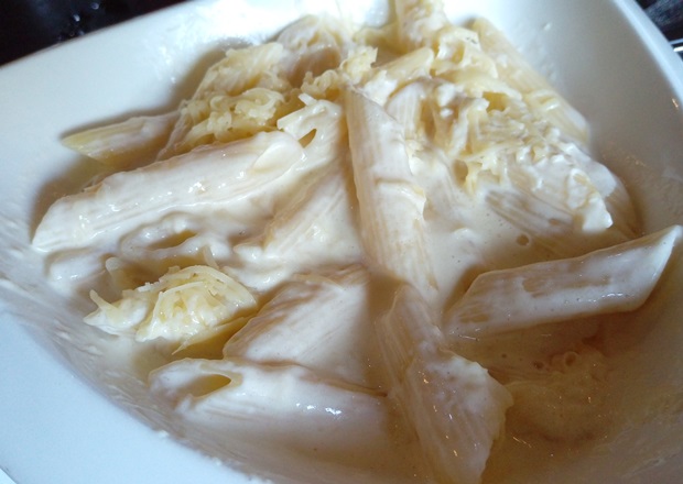 В бульоне из сливок плавали разваренные до неподцепляемого состояния мягкие макароны, которые, как и предыдущее блюдо, присыпали сыром. Никаких четырёх видов сыра, кстати, я не почувствовала — эта каша напомнила мне молочный суп, который я с детства не жалую.