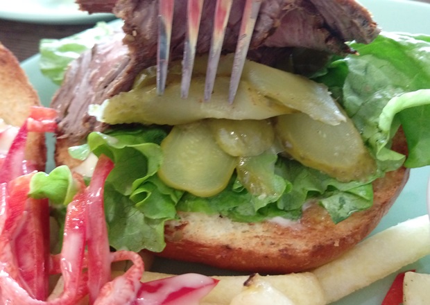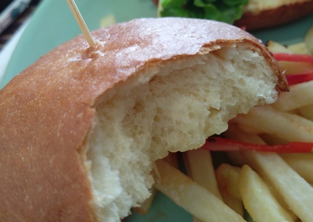 Есть бургер по частям — страшный грех, но, отломив кусочек булки, я поняла, что она мне неинтересна: сухая, явно не первой свежести. Ну и бургер же рваный, обращалась с ним соответствующе. Отложила верхнюю часть, на ней остался почти весь соус — мизерное количество чего-то похожего на соленый клейстер. Внутри обнаружила перец соломкой, кусочки ростбифа, соленый огурец и лист салата. Без соуса, яйца, сыра и лука это было похоже… да даже на салат не похоже. Все воспринималось отдельно. Ростбиф воспринимался хорошо, потому что был самодостаточен — свежий, сочный и мягкий, приправлен специями. Огурцы и перцы самодостаточны не были, поэтому воспринимались так себе.