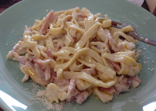 Аллилуйя, наконец-то я смогла что-то здесь съесть. Паста вкусная. Порадовал желточек сверху, редко этой детали в рецепте придерживаются. Много сливочно-сырного соуса в сочетании с нежным копченым беконом, вкусные толстенькие макароны. Я даже немножко выдохнула, но тут принесли «рваный бургер»…
