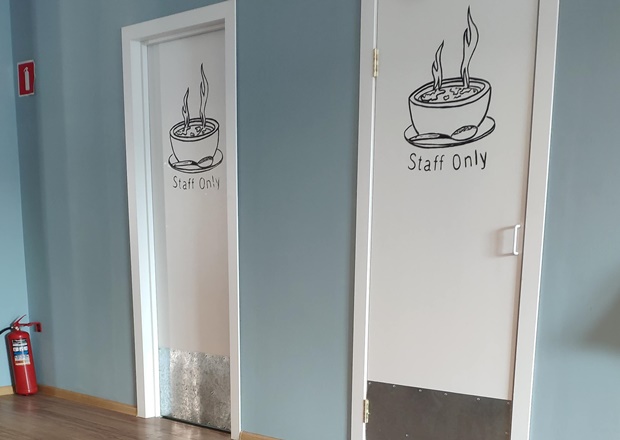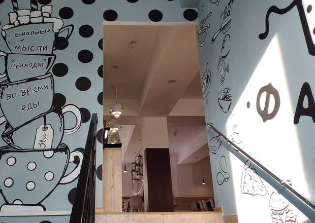 И вот я уже прохожу мимо площади Труда, обращаю внимание на не очень корректное по закону о рекламе приглашение «на самые бурятские позы» и поднимаюсь на второй этаж небольшого здания. С удовольствием отмечаю приятный запах выпечки (хотя позже понимаю, что он доносится из «Сабвэя», соседствующего с «Фартуком») и разглядываю по-детски симпатичные рисунки и надписи, намекающие на легкость и непринужденность формата.