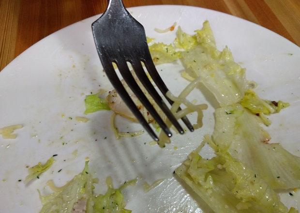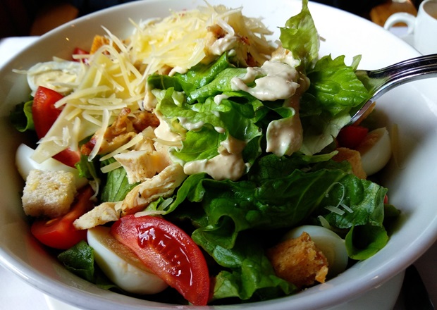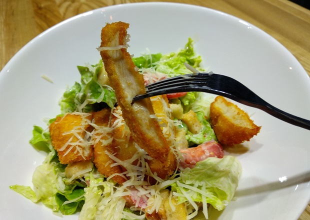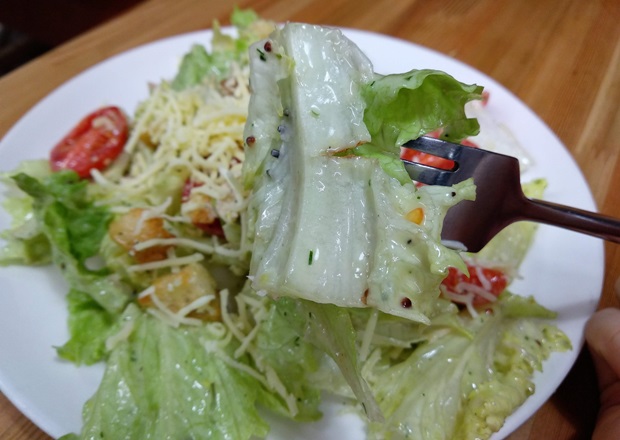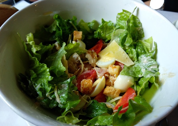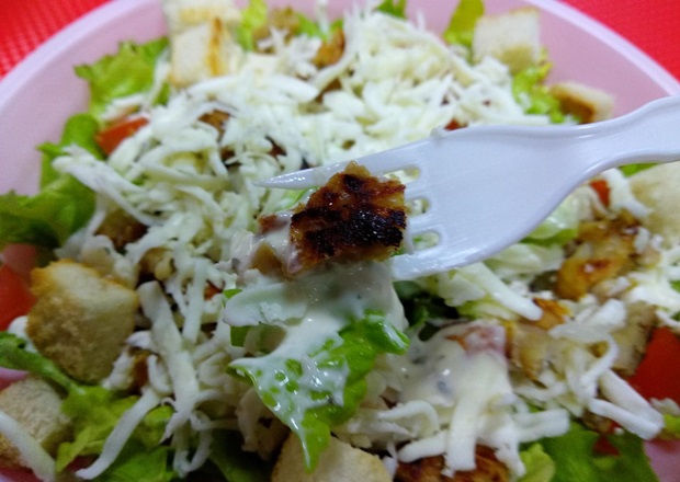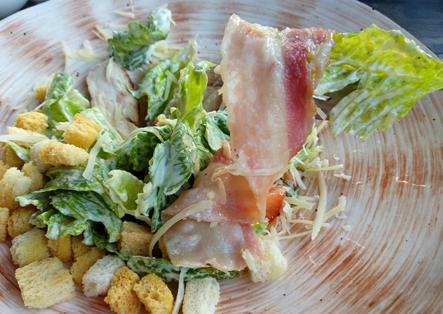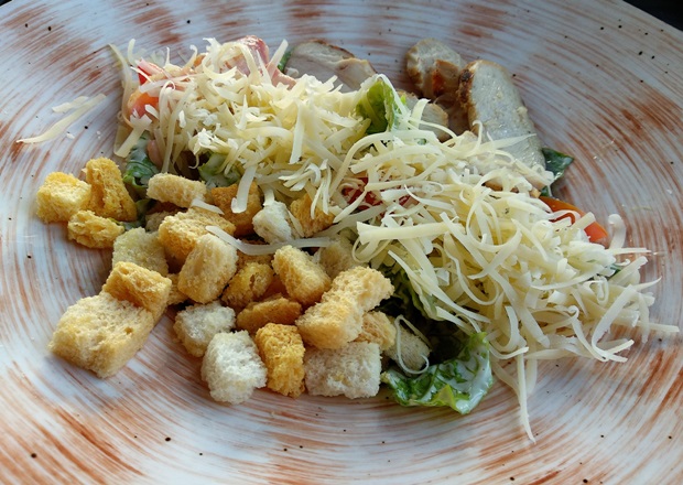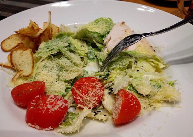 Как только тарелка коснулась стола, я почувствовала громкий, но приятный сливочный аромат свеженатертого сыра. И это был хороший твердый, вероятно, белорусский пармезан. Все листья салата, как того требует традиционный рецепт, обмакнули в соус — не очень густой и не очень жидкий — в целом, как надо. Куриное филе было теплым, только что приготовленным, мягким и сочным — съела его едва ли не всё сразу.