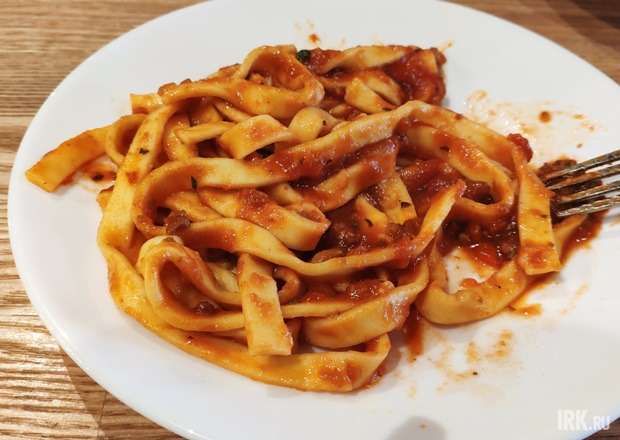 В пасте были хороши макароны, проваренные до нужной консистенции, обилие вкусного мелко нарубленного фарша, присутствие зелени и хороший сыр. Но соус показался излишне сладким. Похоже, повар пытался сбалансировать резкую томатную кислинку и перестарался.