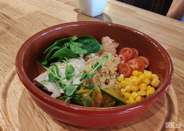В глубокой миске нашла ровные слайсы из мяса курицы, мякоть помело, киноа, томаты, свежий базилик, стебли гороха, зеленую фасоль, кукурузу и огурцы в соусе кимчи. Понравилось оригинальное сочетание свежей зелени, овощей и пикантного острого соуса. А курица и зерно делали блюдо еще и сытным. Отлично. Кстати, сейчас, во время поста, боул предлагают также без птицы.