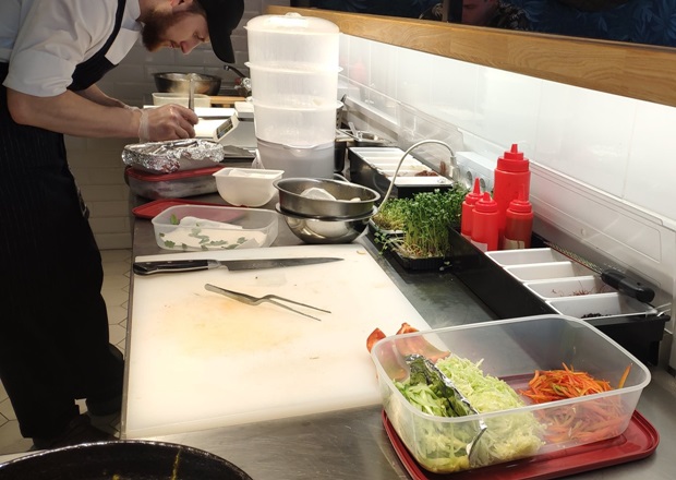 И главным образом такое впечатление создает персонал. В зале хозяйничают официанты, один слаще другого (и парни, и девушки): юные, улыбчивые, одетые в одинаковые светло-коричневые комбинезоны, белые футболки и мягкие кроссовки. Ребята сопровождают гостя с порога: подхватывают верхнюю одежду, провожают за столик, подсаживаются, поясняют, что из себя представляет концепция бистро (адаптированная азиатская кухня), каждая категория меню и, если нужно, способны подробно рассказать о каждом блюде.