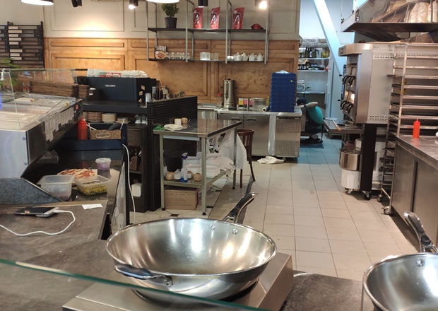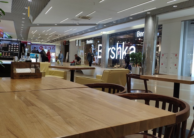 Помещение весьма условное (стены всего две) и столики для гостей выставлены за зоной кафе в общем коридоре торгового центра. Но несмотря на это, нельзя назвать заведение совсем неуютным. Местами здесь даже мило. Над барной стойкой на одной из стен висит картина, например. Какая-никакая, но пространство облагораживает. На другую стену повесили полку с декоративными бревнами, под ней открытая кухня, на которой хлопочут повара: раскатывают тесто для пинсы и ставят ее в печь. Если скучно, можно понаблюдать за этим и даже поболтать с ребятами, они показались мне дружелюбными.