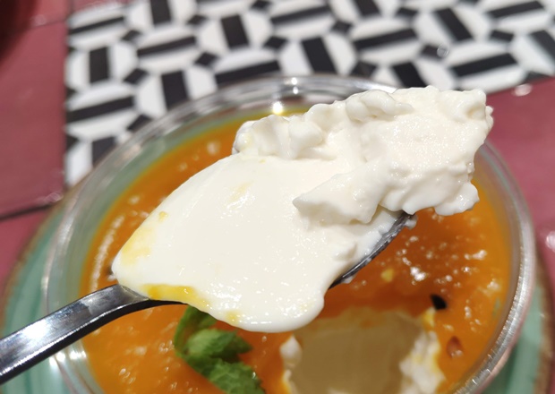 Панна котта сейчас мой любимый десерт. Пробую везде, где вижу. Увы, далеко не всегда нравится консистенция. Например, недавно в кофейне «Тревелерс» на Киевской крайне удивилась странному прочтению рецепта. Но здесь десерт был отличный. Однородная не водянистая насыщенно молочная масса держала форму, чуть покачиваясь на ложке (желатина здесь в самый раз), и легко таяла на языке. Прекрасно дополняла нежную желешку легкая кислинка натурального пюре из манго и маракуйи. А еще понравилось, что в банке десерта много, можно даже поделиться с друзьями, с радостью понять, что они в панна-котте ничего не понимают, забрать назад и и с не меньшей радостью осознать, что у тебя еще добрая треть баночки. С удовольствием закажу снова.