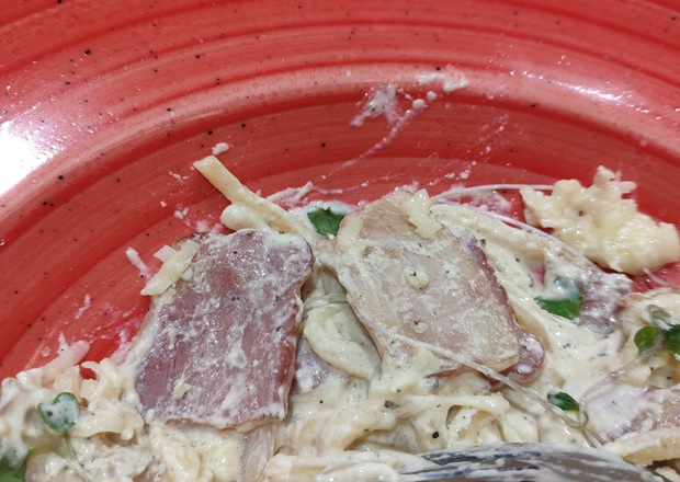 Длинные толстенькие макароны имели плотную консистенцию, вполне вписывающуюся в обозначение «аль денте». Эластичные и упругие, они очень походили на домашние — тут без вопросов. Понравился мне и соус: он обволакивал каждое изделие, а не стекал по ним в лужу на дне тарелки. Помимо бекона было еще какое-то копченое мясо, все это нарезали тонкими пластинками. В общем, хорошо было: сливочно-пикантный вкус, свойственный карбонаре, я чувствовала и ела с удовольствием.