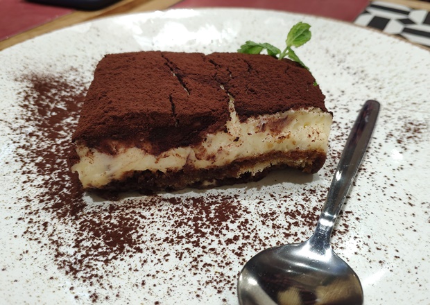 «Злющий тирамису», — отметила у себя в блокноте. Мне было горько. Хотя за столом нашелся человек, который заверил меня, что так и должно быть. Вот не знаю, бисквит еще был слишком мокрый, кофейный вкус и горький трюфель сверху слишком уж жестоко забивали нежный крем. Он, к слову, был даже очень недурственный: воздушный и ярко-сливочный. Попробуйте все же, пожалуйста, и расскажите, что вы думаете . Допускаю, что привыкла к местным адаптациям тирамису, поэтому сразу понять истинный итальянский вкус не смогла.