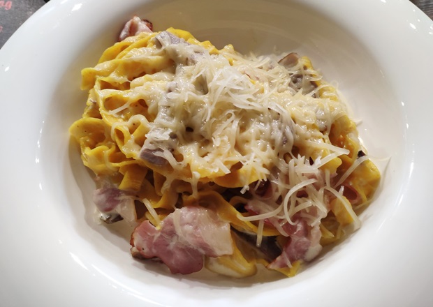 Очевидно, повара подумали, что бекон, сливочный соус и сыр недостаточно насытят гостя. И покрошили в блюдо еще свининки. Вот той самой, вареной, что из борща. Я сначала подумала, что пара кусочков залетели сюда случайно, но нет — количество мяса вполне можно было сопоставить с беконом.