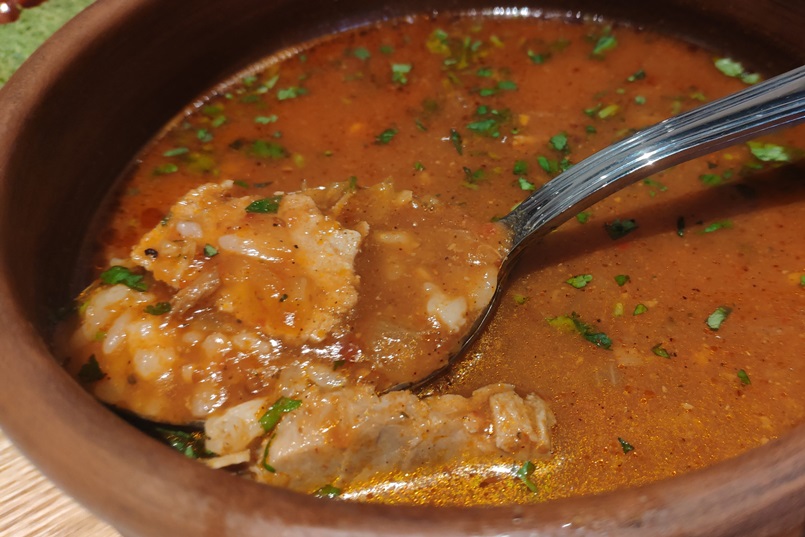 Только во время написания статьи, изучая счет, вспомнила, что я заказывала сметану. Мне ее не принесли, но посчитать не забыли. Впрочем, я была вполне довольна бульоном и без сметаны: густой, наваристый, не слишком жирный, в меру пряный, перечно-томатный. Смутила жесткая, сухая и жилистая говядина, нарезанная крупными пластиками, и плохо проваренный рис, который прилипал к зубам. Есть было все равно вкусно, я далеко не сразу отодвинула тарелку: бульона наварили много, и он определенно был тут главным. Но за ингредиенты странной консистенции, плавающие в нем, не могу не снизить балл.