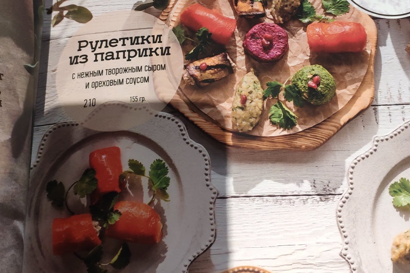 Выглядело блюдо очень аппетитно: я даже поразилась, насколько оно походило на фото в меню. Попробовала пхали в рулетиках и в крепком вяленом перце, свекольные и баклажановые — вкусно. Отличное сочетание овощей, мягкого сыра, орешков и пряностей. А потом я попробовала зеленый пхали… и еле сдержалась, чтобы не выплюнуть это на салфетку. Кажется, в меню было указано, что он из шпината, но мне казалось, что это пюре из осоки или какой-то ботвы. Абсолютно несъедобная вещь, которая очень портит впечатление от блюда.
