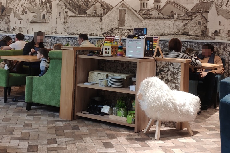 Интерьер незамысловатый, местами даже симпатичный. Приятная цветовая гамма, песочного цвета пол и в том же тоне фотопанорама грузинского городка на стене. Миленькие лампочки протянуты на тонких проводах сквозь навес из искусственных листьев, на которых болтаются очень славные барашки. Есть детские игрушки. Мебель не вызывает приятного удивления, но в целом вполне сносная.