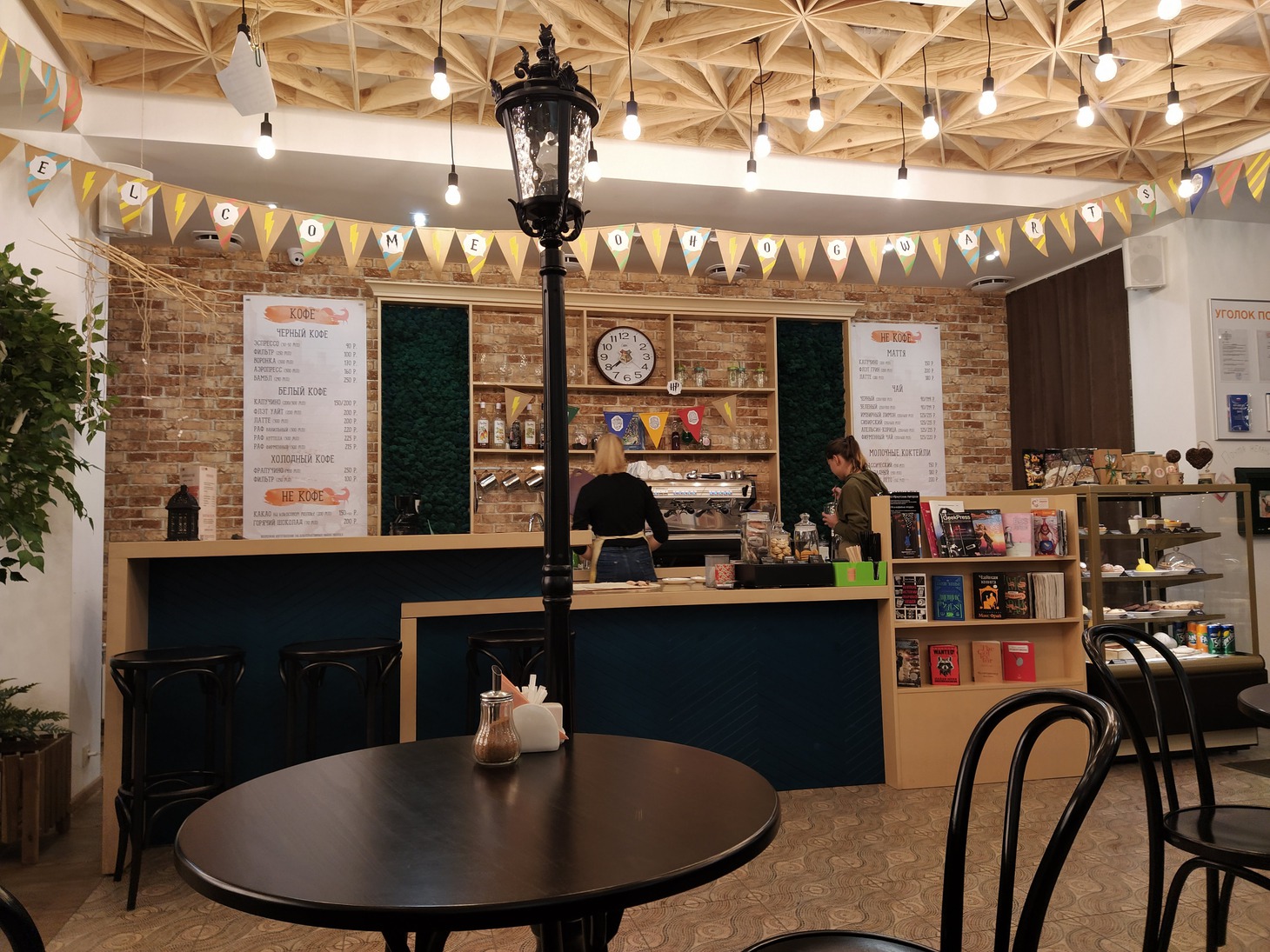 Судить об атмосфере, безусловно, было бы справедливо, побывав на одном из мероприятий кофейни. Однако что имеем – то имеем. Я была в кофейне два раза: днем и вечером. Оба раза один из столиков занимали молодые люди, игравшие в «настолки». Это меня зацепило. Того самого «читай-твори» духа кофейне добавляли остатки квеста по Гарри Поттеру: в зале и туалете были расклеены части загадок.