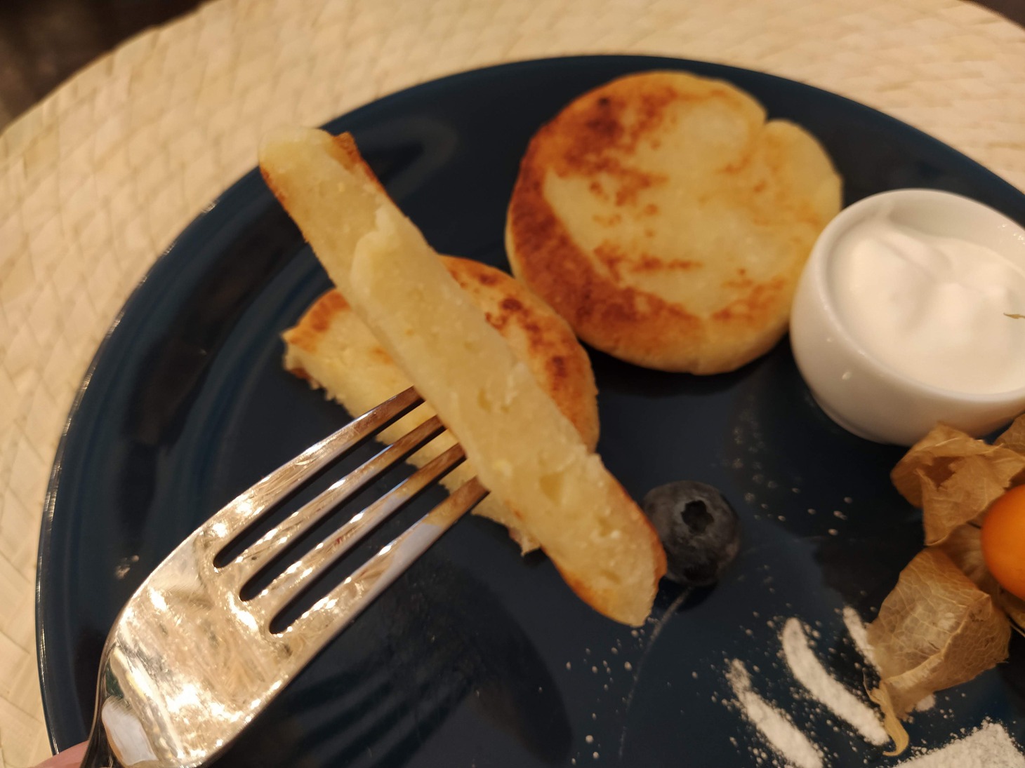 Возможно, у повара испортилось настроение, когда он готовил это блюдо. Хуже сырников я в жизни не ела. Это были кругляши из теста, спрессованные до состояния резины. Из чего они вообще? Творог не может иметь такую отвратительную структуру. Эти сырники, кажется, даже поскрипывали на зубах. При этом сами по себе были абсолютно безвкусные: ни соли, ни сахара, ни творожной горчинки или кислинки. В общем, полный провал.