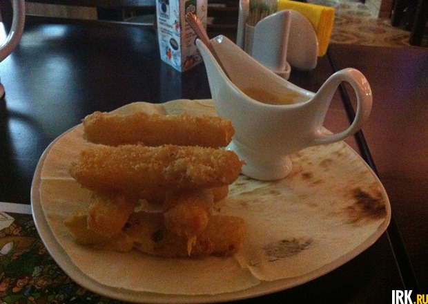 Закуска, которую в баре готовить не умеют совсем. Нам принесли шесть палочек на лаваше (прямо на лаваш почему-то и соусницу поставили), из них четыре представляли собой панировку без сыра. Мы подозвали Надежду, чтобы рассказать о проблеме, и пока она нас слушала, подлетела девушка, похожая на администратора, посмотрела на наши палочки и выдала гениальную фразу: «Так это просто сыр вытек», — и отошла. Я не разглядела бейдж, возможно, на нем была надпись «Капитан Очевидность». Впрочем, Надежда тут же подхватила палочки и, извинившись, унесла их на кухню. Через некоторое время нам принесли уже почему-то пять палочек, три из которых были наполнены-таки жирноватым, не очень вкусным сыром. Две снова были пустые, но мы не стали больше беспокоить поваров, что поделать: вытекает сыр…