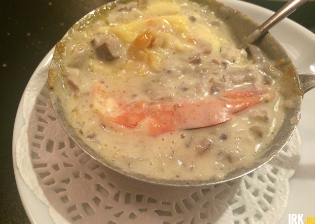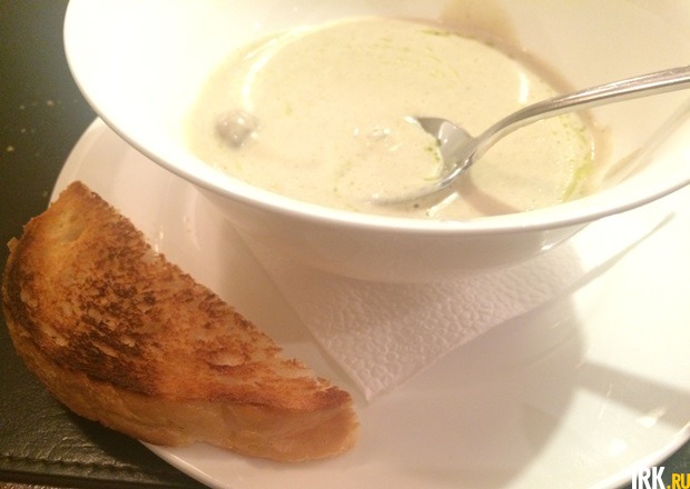 Юлия любезно предложила нам разлить порцию в две тарелки. Да, так можно. Супчик восхитительный: плотный, густой, много жирных сливок и приятного грибного вкуса. Сытный и питательный настолько, что порцию действительно можно поделить пополам.