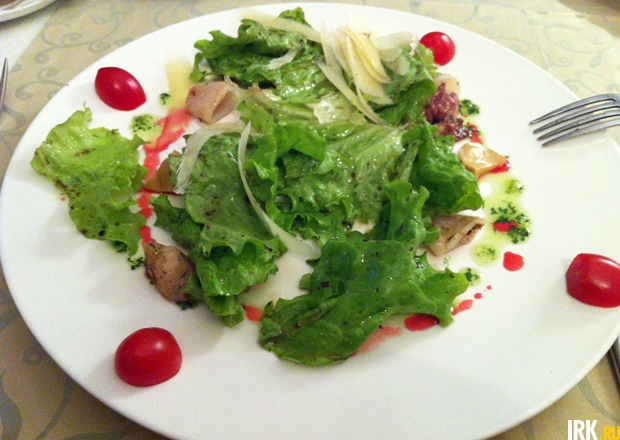 Никак не ожидали, что половина порции салата «Капричио» будет настолько маленькой. В меню указан состав: микс салатов с обжаренными кальмарами, белыми грибами, помидорами даттерини с соусом пармезан. Выглядит блюдо художественно, красочно — я даже залюбовалась. Но спустившись на землю, перемешала листики в середине, а там — ничего, кроме сыра и вороха обыкновенного зеленого салата (где же микс?!), хорошо сдобренного маслом, бальзамиком и специями, букет которых (нужно отдать должное) был богатым и насыщенным.