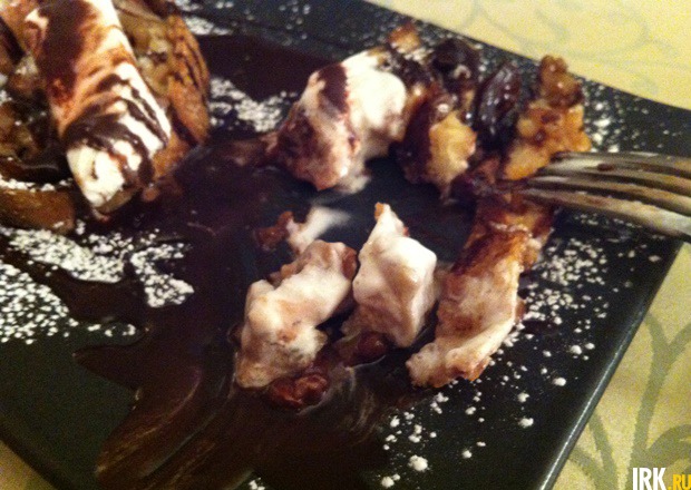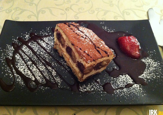 Блюдо, не имеющее никакого отношения к итальянской кухне, нам просто захотелось здесь попробовать. Удивились крайне, увидев три тонюсеньких слоеных ломтика с изюмом и небольшим количеством яблок, политых шоколадным соусом и «украшенных» ломтиками пломбира странной неровной формы. Форма у десерта отсутствовала: сложно было отломить кусок – все разваливалось и превращалось в кашу. На вкус — как вымокшее слоеное тесто с изюмом, в шоколаде и мороженом.
