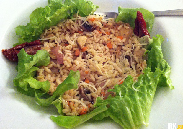 Неплохой сочный рис аль денте, пропитанный куриным бульоном, с ароматом грибов, которых в этот раз не пожалели. Блюдо прекрасно дополняли пикантные вяленые перчики. Однако для ризотто вышло суховато: по рецепту, рис должен быть не просто пропитан — он должен плавать в большом количестве бульона, но в нашей тарелке бульон вовсе отсутствовал. Ну и половина порции — это все-таки маловато.