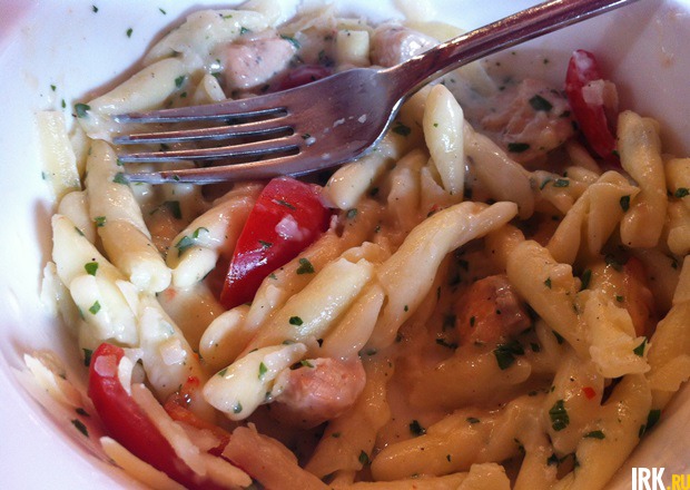 А вот паста восторга не вызвала. Макароны как макароны. С рыбой и помидорами. Очень перченые, слишком — сладкого соуса я не почувствовала. Тесто неинтересное, тручиоли мне даже показались слегка разваренными, водянистыми.