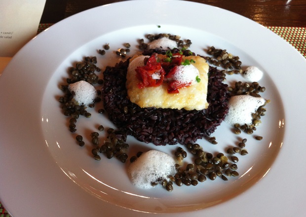 Впервые пробовала рис Венере (который посредине, под рыбкой), очень своеобразный и вкусный. Клейкий, мясистый и сочный. Блюдо было украшено пенками, так и не смогла определить, что за вкус — едва уловимый, похож на рыбный. Рыбка, посыпанная маринованными перцами и мелко нарезанными осьминожками, не произвела впечатления. Ее как будто передержали, она была безвкусной и водянистой.