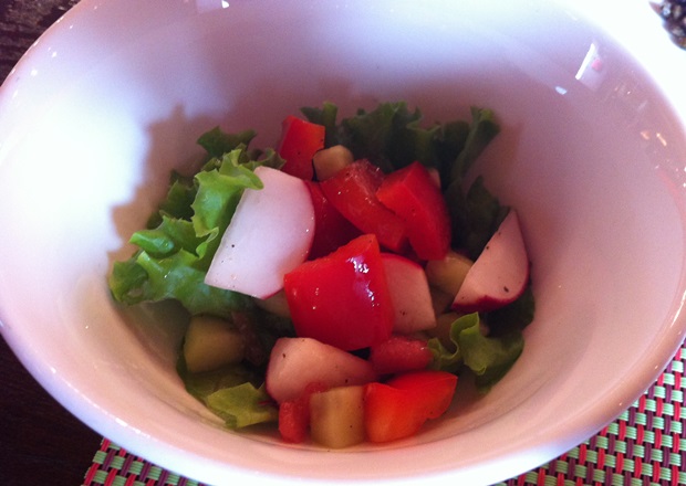 К рыбе подали прекрасный в простоте салат из перцев, огурцов и редиса, слегка приправленный уксусом и маслом. Ела с удовольствием, пока не обнаружила небольшой темный волосок. Давненько такого не было, даже в позных как-то обходилось… Видимо, повар на кухне пренебрегает головным убором. О случившемся сообщила официанту, девушка искренне извинилась и предложила заменить блюдо. Но это было ни к чему, я уже наелась. Тогда мне принесли конфеты в качестве извинения. Насколько я знаю, их подают всем гостям вне бизнес-ланча.
