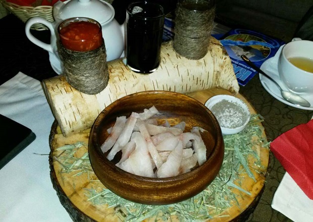 В меню увидел похожее блюдо — расколотку из муксуна на льдине. Решил попробовать, но с ней не заладилось вовсе. В меню было указано, что блюдо подается на льдине. Как льдина ассоциируется у шеф-повара с деревянной тарелкой, в которой принесли муксуна, я не понял. Однако лёд быстро нашелся в самой рыбе, она опять хрустела от переморозки.